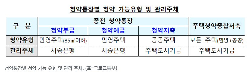 통장 유형에 따라 민영과 공공 주택 하나만 청약이 가능했던 종전의 청약예금, 청약부금, 청약저축통장 등 입주자저축을 모든 주택 유형에 청약할 수 있는 주택청약종합저축통장으로 전환을 허용하기로 했습니다.