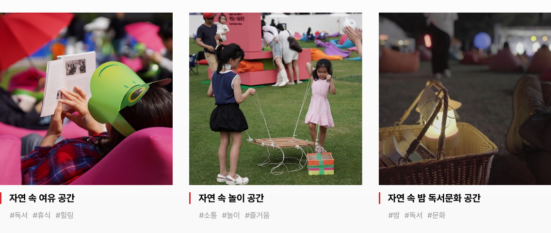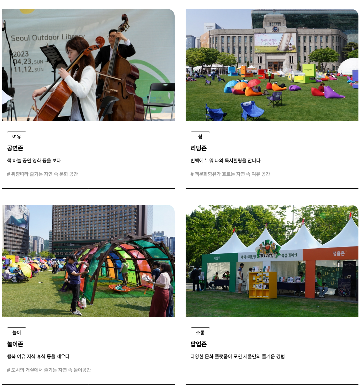 서울광장은 여유의 공연존, 쉼의 리딩존, 놀이의 놀이존, 소통의 팝업존등의 공간을 나누어 다양한 프로그램을 제공하고 있습니다.