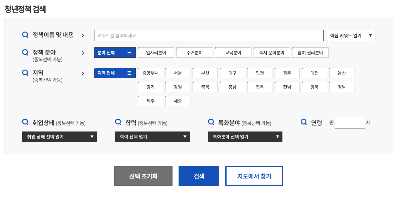 위의 내용 이외에도 국가에서 지원하는 청년 지원사업종류는 너무 많습니다. 나에게 적합한 정책은 어떤 게 있는지 확인하기에  어려움을 겪는 청년들이 너무 많을 것 같습니다. 아래에서 소개해드릴 '온통청년'이라는 곳에서는 분야별, 지역별, 연령등 세부적인 검색을 통하여 나에게 맞는 정책을 찾을 수 있습니다.
