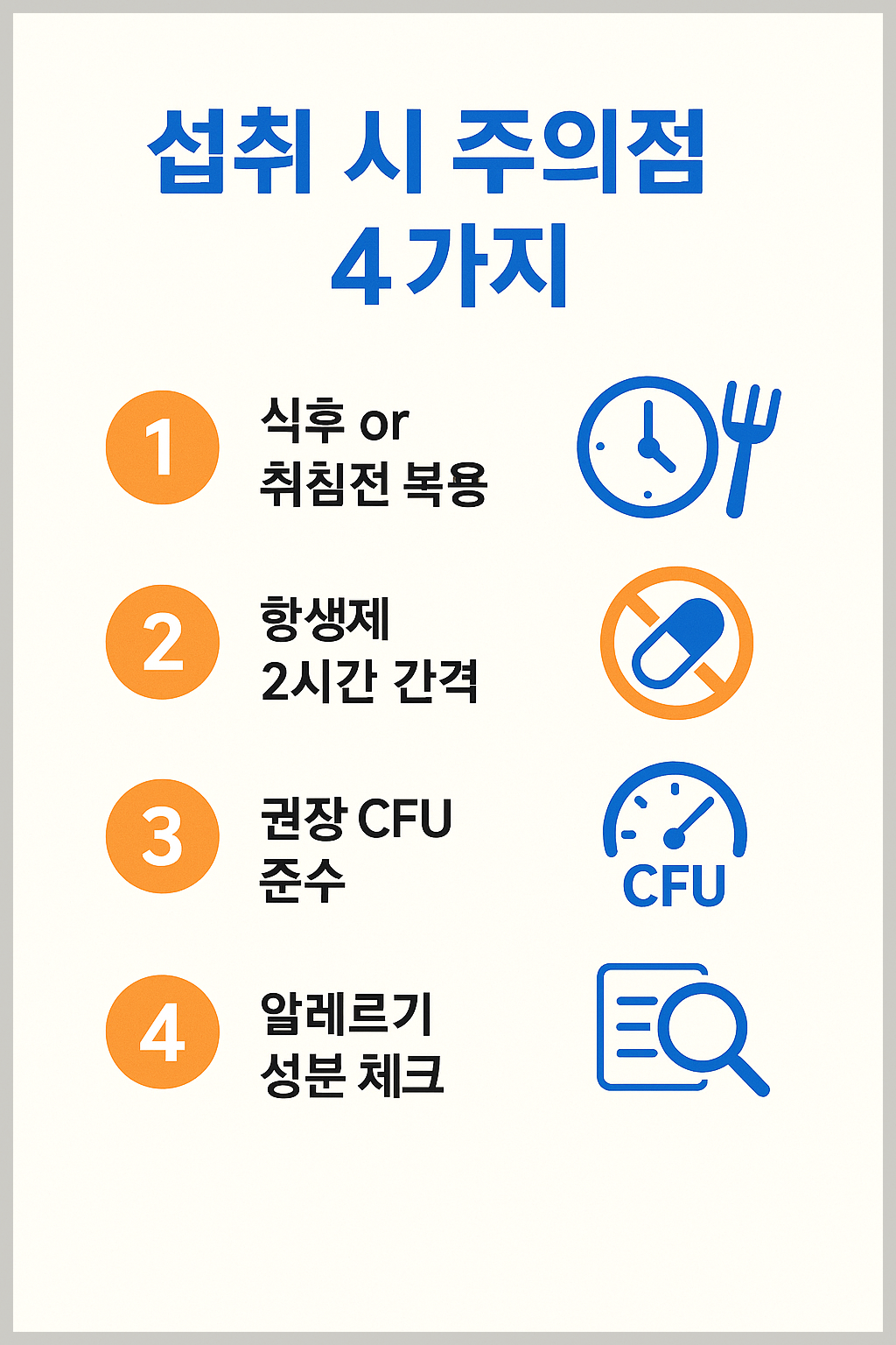 식후 1 캡슐, **CFU·균주**·첨가물·인증 4요소만 지키면 OK.