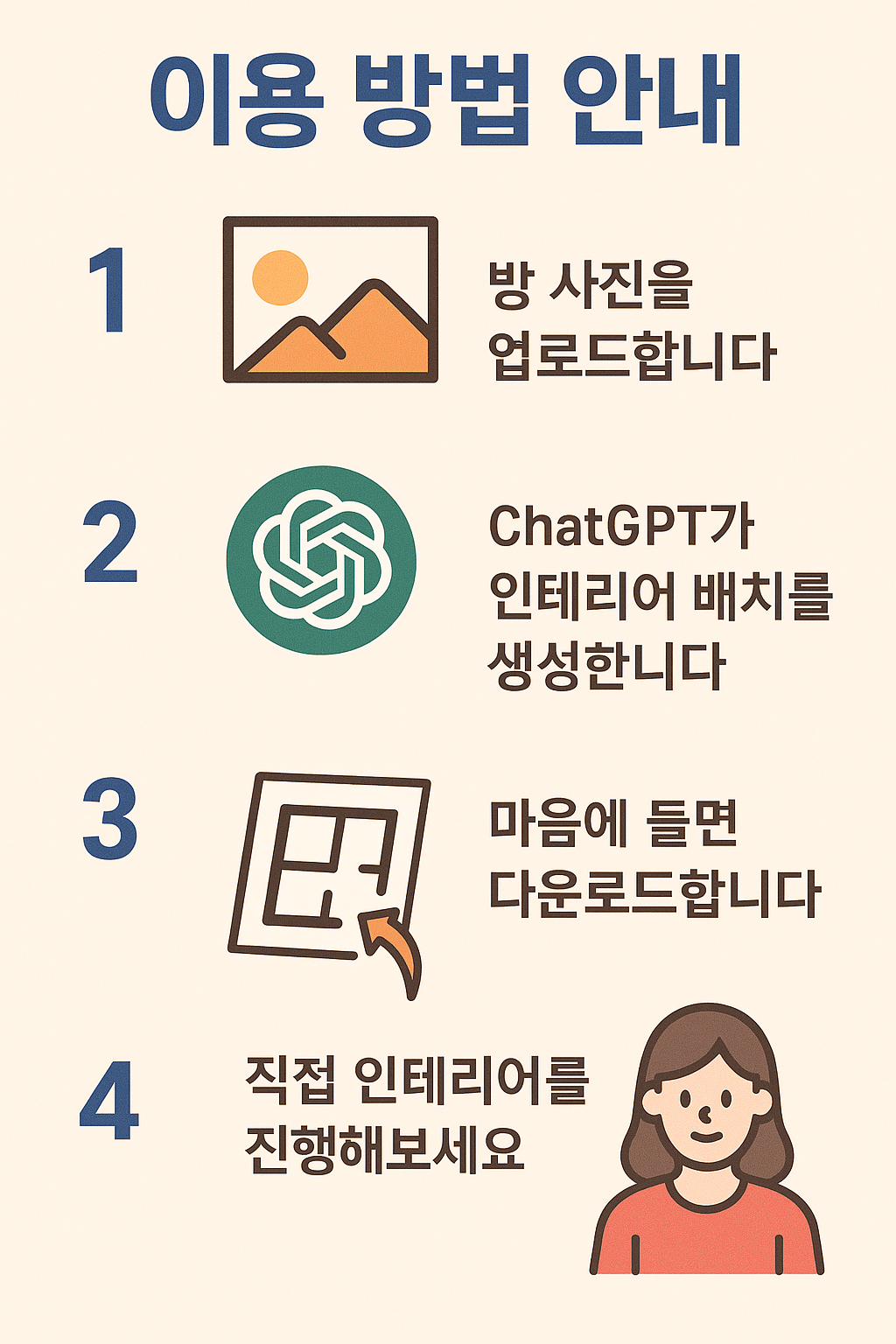 이제는 ChatGPT의 인공지능 기능을 활용해 손쉽게 인테리어 배치를 도와줄 수 있습니다.