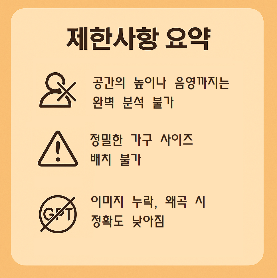 또한 3D 시각화나 AR 배치 기능은 없으며, 제안된 내용은 이미지 기반 해석에 따라 오차가 발생할 수 있습니다.