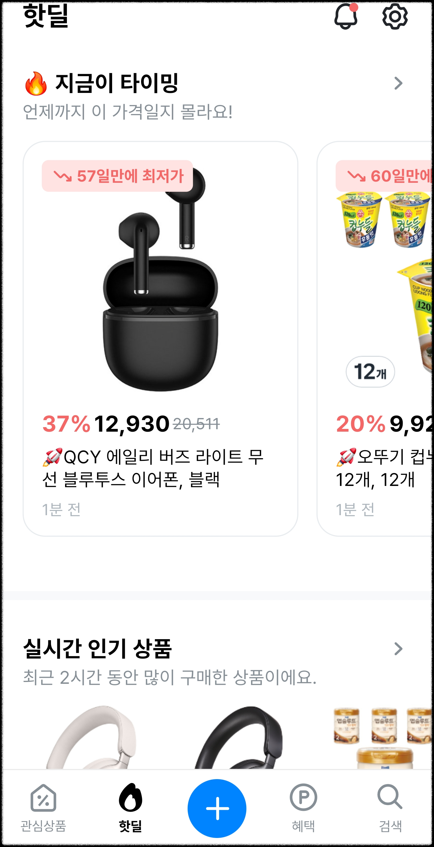 그리고 쿠팡에서 진행하는 핫딜 제품들의 확인이 가능합니다. 실시간 인기 상품이라던지 쿠팡 판매 제품 중 역대급으로 할인을 많이 해주는 제품 소개도 해주고 있습니다.