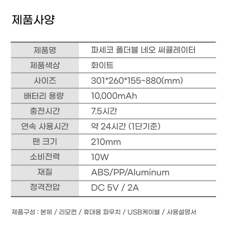 - 특징 : 완충 시 최대 15시간 사용(1단계 기준), 핸디형&데스크팬 모두 사용가능. 4단계 풍속조절 및 간편한 분리세척.
