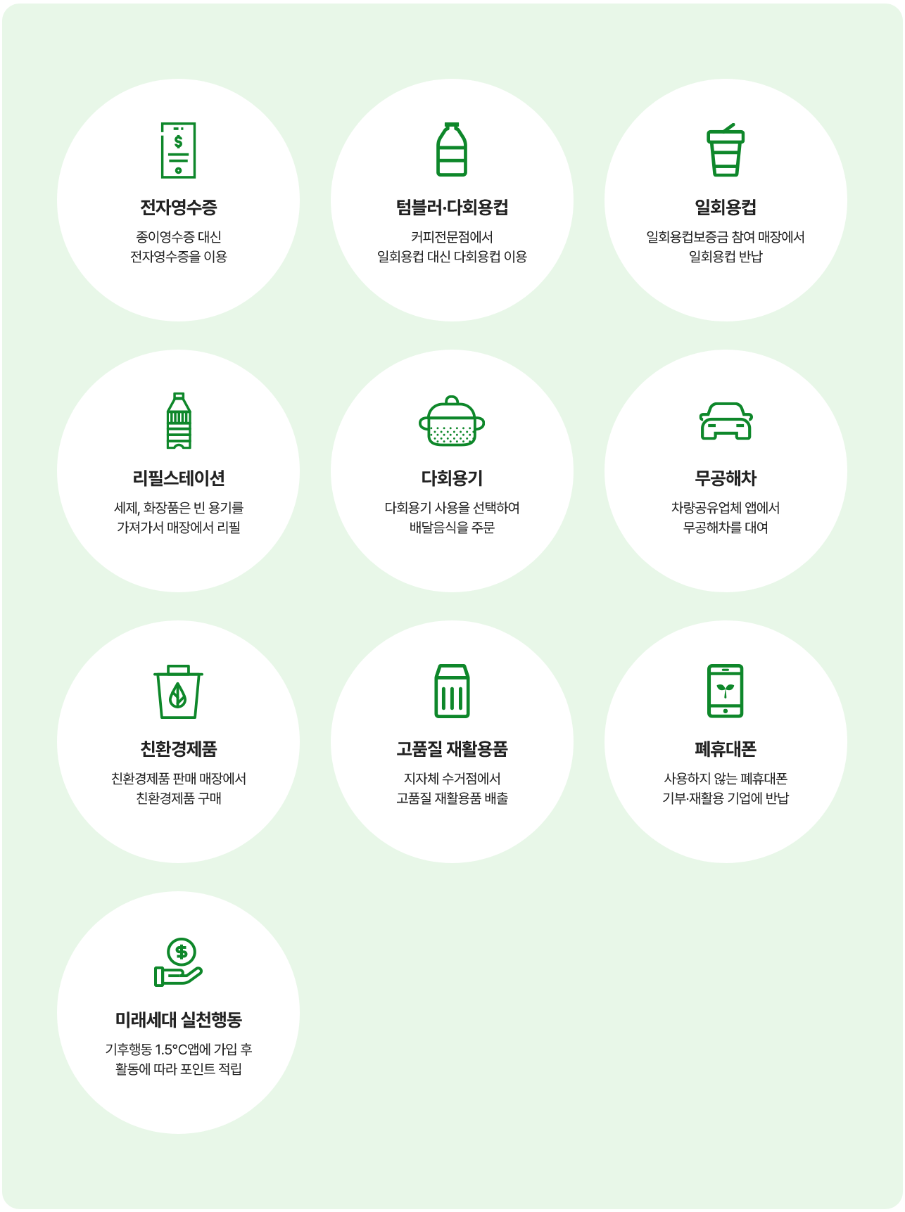 - 친환경제품 구매 : 그린카드(실물)를 사용하여 에커모니 포인트가 100포인트 이상 적립 및 총 결제 금액이 2,000원 이상 또는 '친환경제품 구매 참여기업'에서 결제 수단에 관계없이 2,000원 이상 친환경 제품 구매
