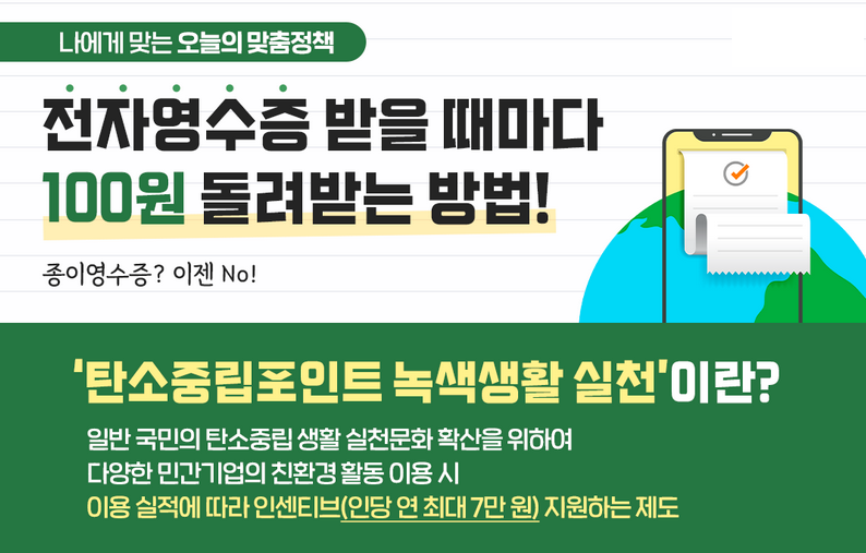 탄소중립포인트라고 들어보신 적 있으신가요? 일반 국민의 탄소중립 실천문화 확산을 위하여 다양한 친환경활동 시 이용 실적에 따라 현금 혹은 카드사 포인트 등으로 환급해 주는 제도입니다.