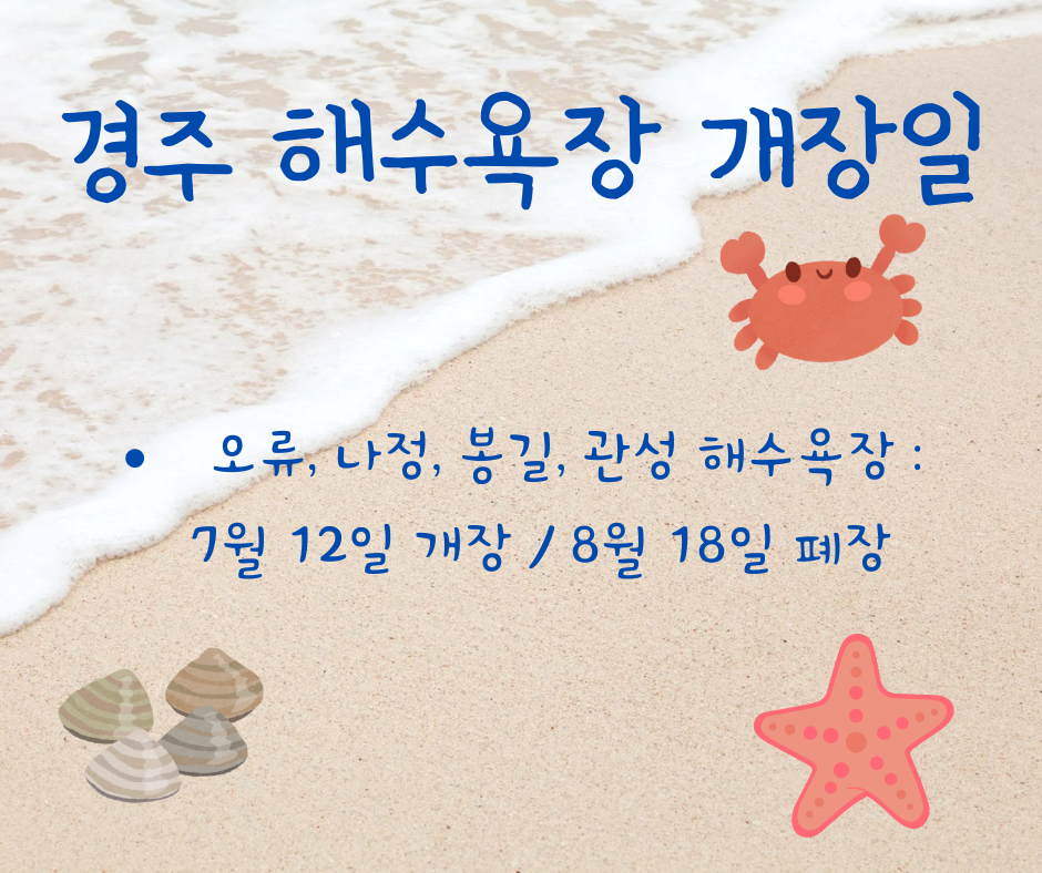 무더운 날씨가 계속 이어지는 가운데 많은 분들이 물놀이를 갈 계획을 많이 준비 중입니다. 요즈음에는 여기저기 워터 파크가 많이 생겨서 계절과 날씨에 크게 제한 없이 물놀이를 많이 즐기지만 여름이 다가오면 뭐니 뭐니 해도 해수욕장만큼 물놀이하기 좋은 곳도 없다고 생각됩니다. 그래서 오늘은 포항과 경주 쪽에 있는 해수욕장의 개장일에 대해서 알아보도록 하겠습니다.