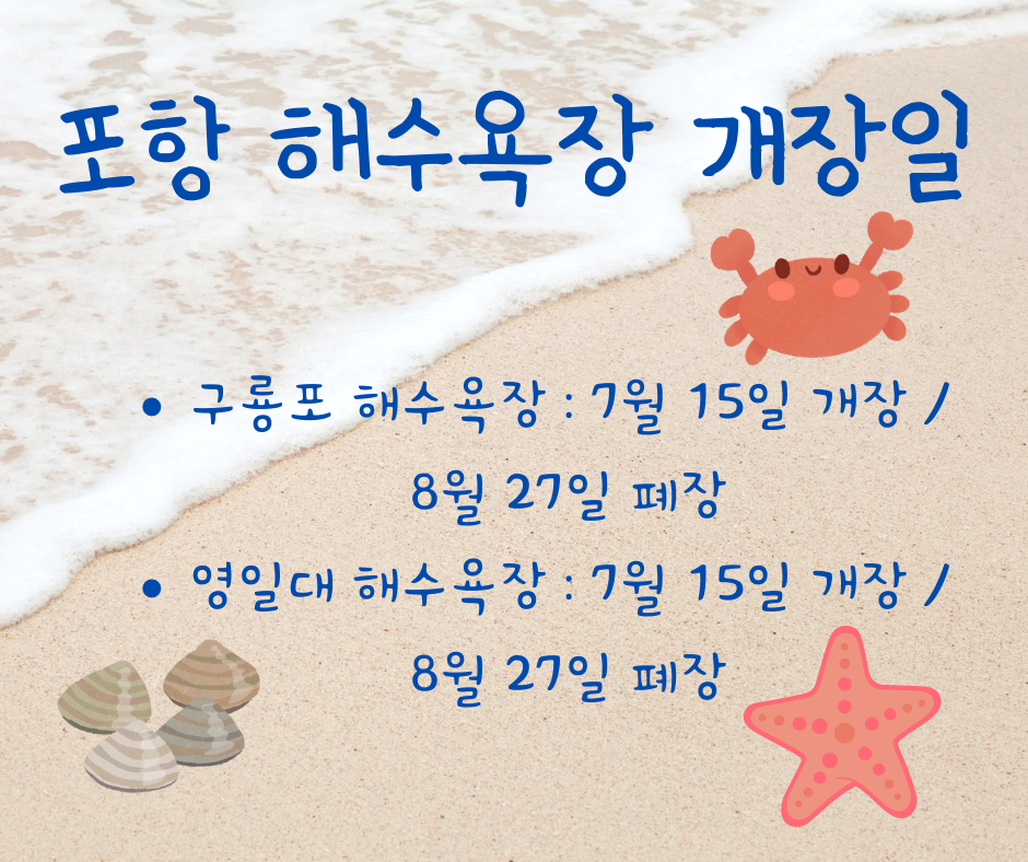 포항 해수욕장 중에 개장일을 발표한 곳은 구룡포와 영일대 해수욕장입니다. 개장일은 두 곳 모두 7월 15일이고 폐장일은 8월 27일입니다.