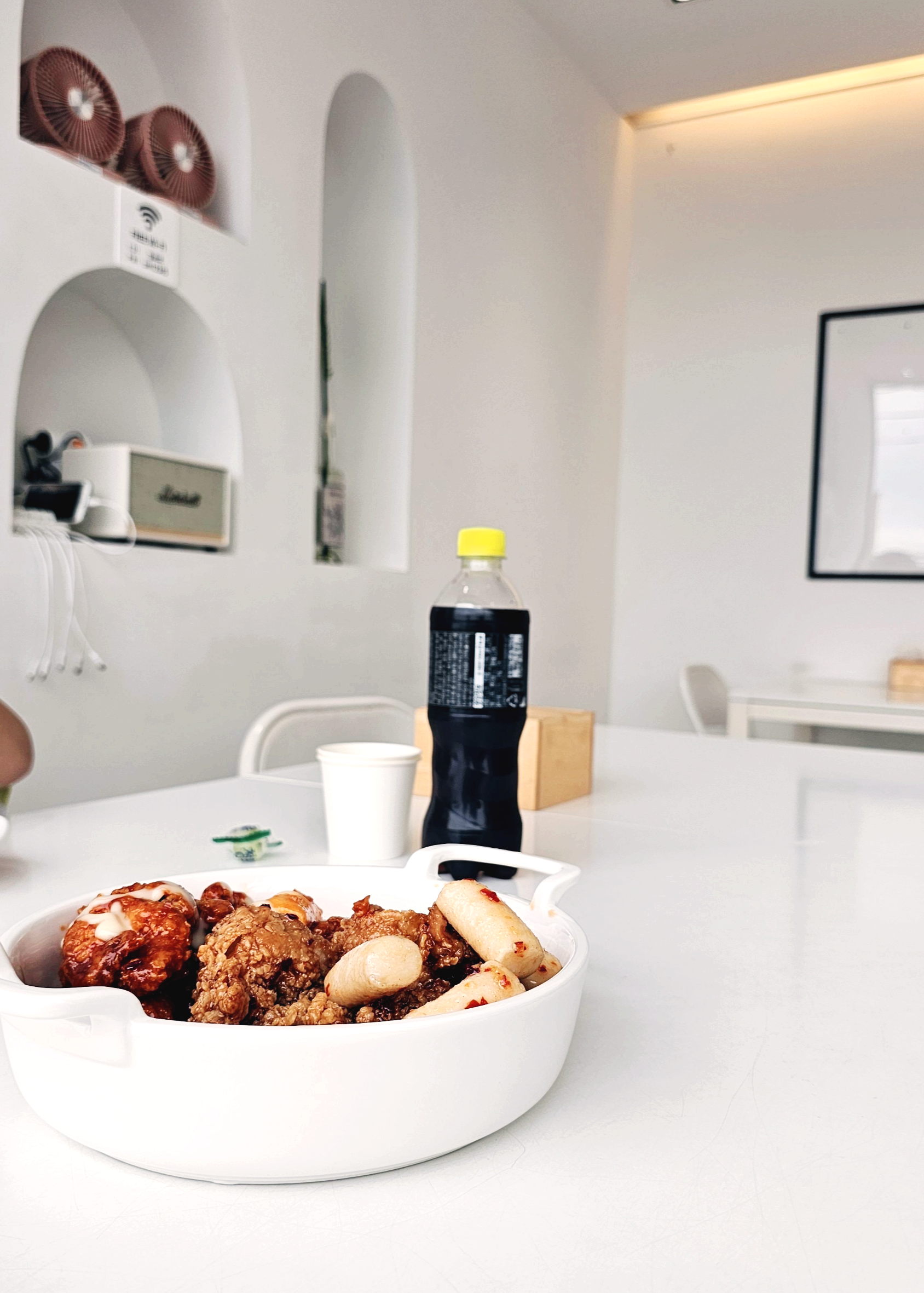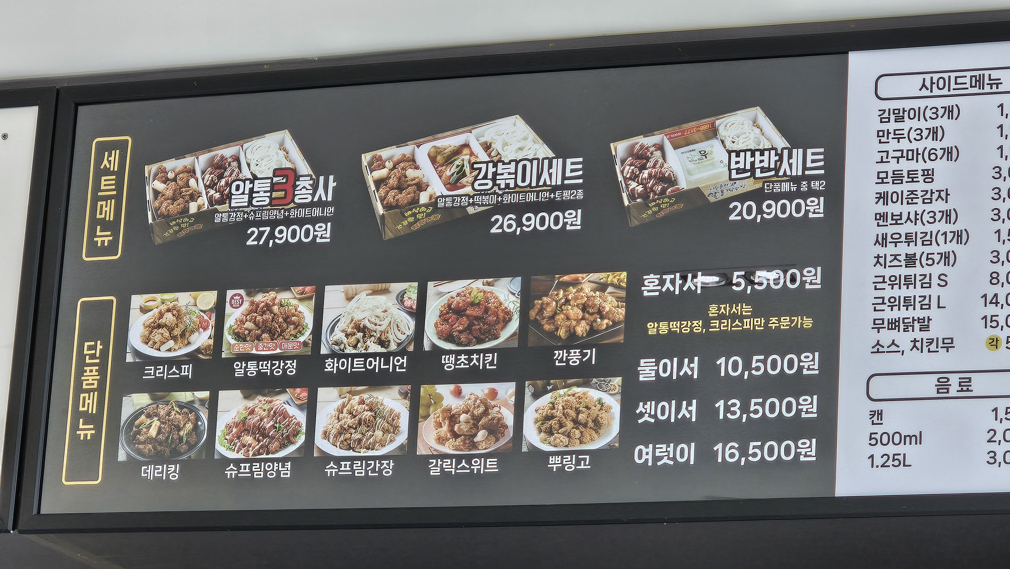 가오픈기간에 방문한 첫 번째 홀 손님이라고 콜라와 뽀로로 음료수까지 주셨던 사장님~적당히 배만 채우고자 '둘이서' 메뉴를 시켜서 먹었는데 양도 푸짐했고 금방 튀겨서 나온 닭강정이라서 그런지 바삭하고 쫄깃했습니다.