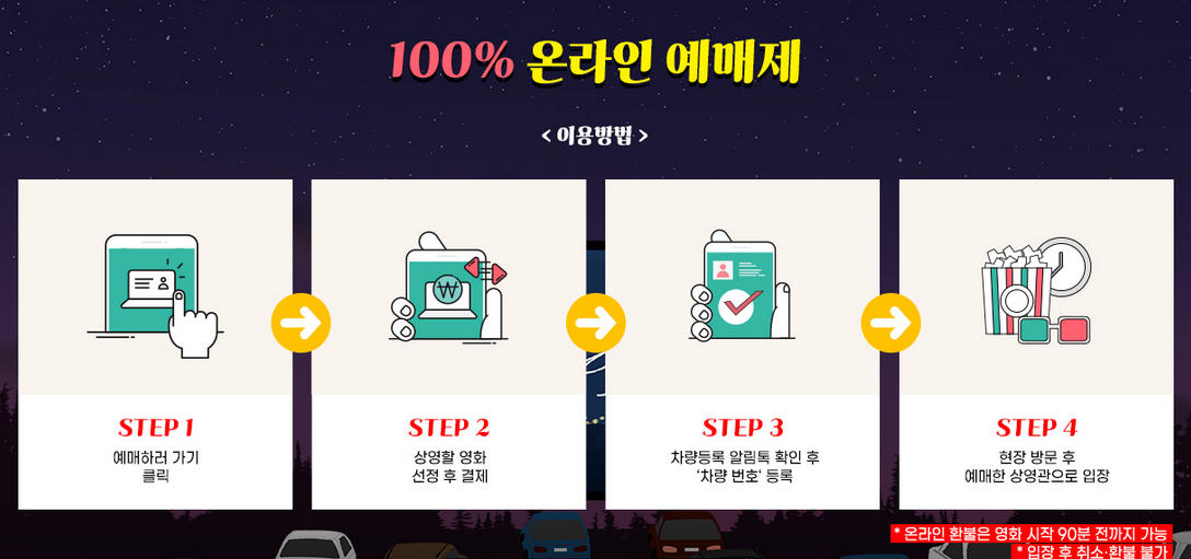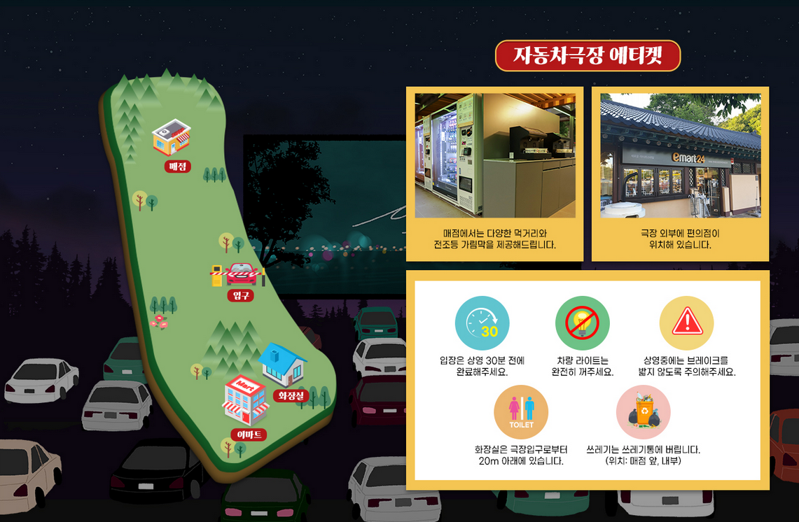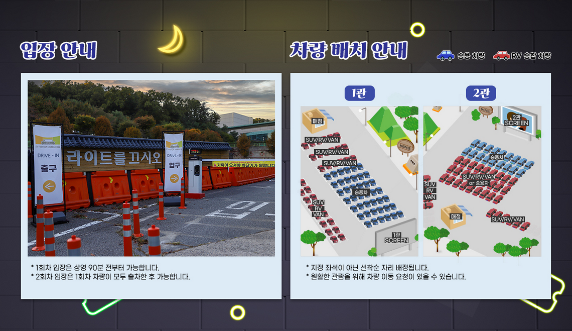 - 입장은 상영 30분 전에 완료해 주시고 상영시 차량라이트는 완전히 끄고 상영 중에는 브레이크를 밟지 않도록 합니다.