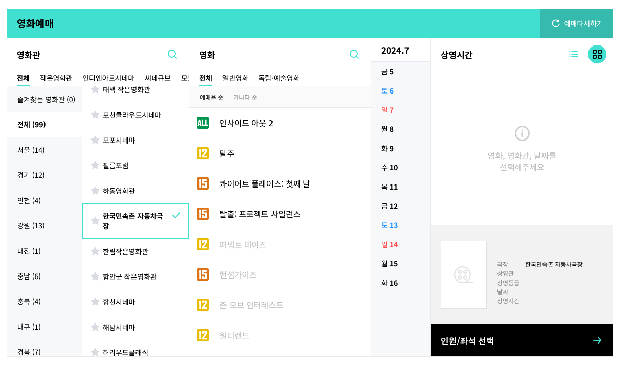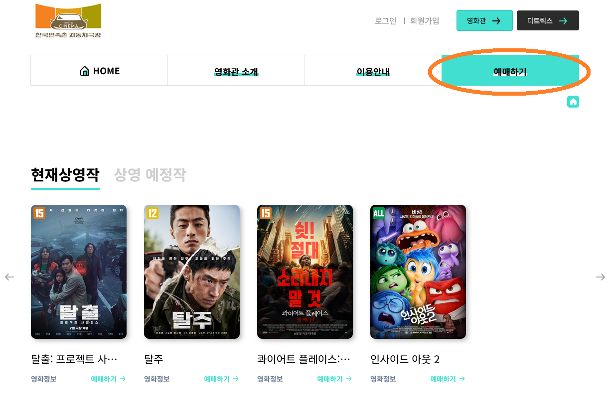 아래의 화면에서 예매하기 버튼을 누르시면 장소, 영화, 날짜 등을 선택하실 수 있습니다.