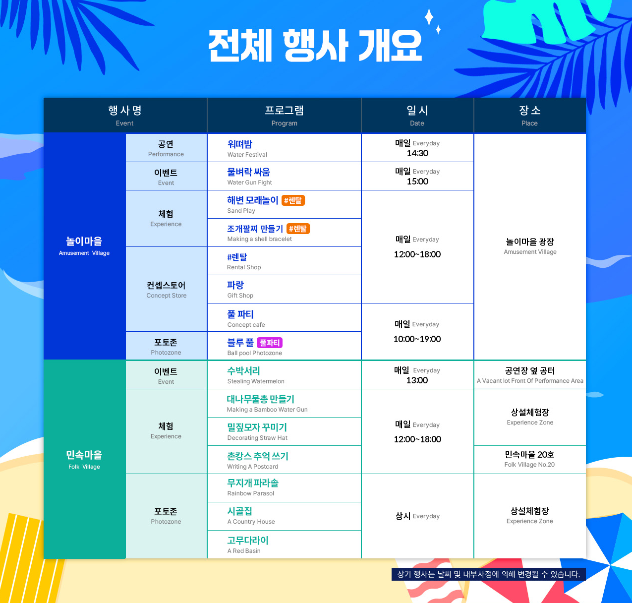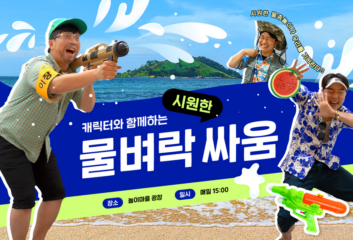 한국 민속촌이 속촌해수욕장이라는 이름으로 개장을 했습니다. 더욱 시원하고 신나게 돌아온 '워뗘밤', 여러 캐릭터들과 함께하는 시원한 '물벼락 싸움'행사 이외에도 '조개팔찌 만들기' 등의 체험도 진행하게 됩니다.
