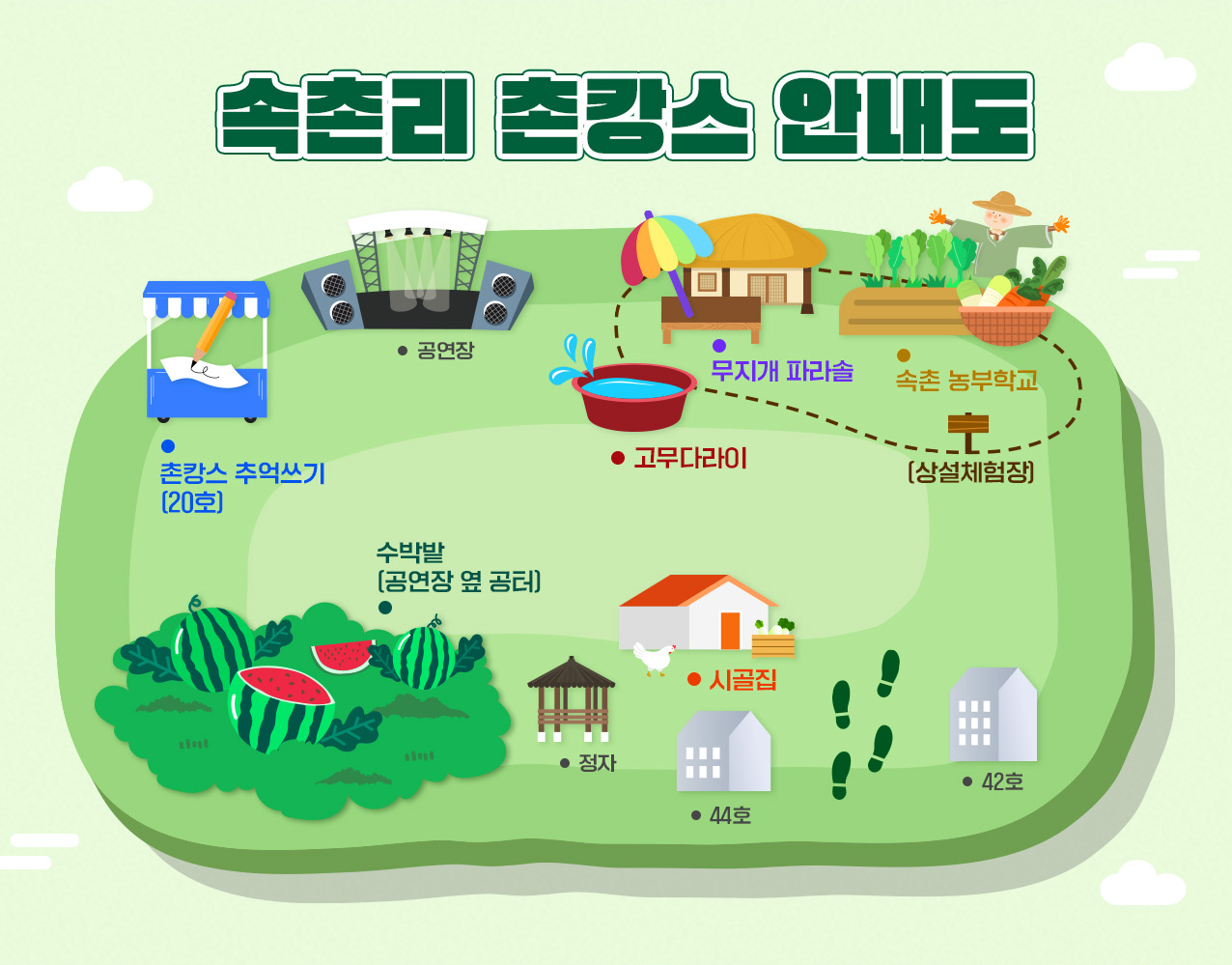 한국 민속촌내에 위치한 속촌리라는 마을에서는 다양한 촌캉스 행사 또한 진행 중입니다. 수박을 햔 질주 '물 튀는 수박서리', 속촌 농부학교에서 진행하는 '밀짚모자 꾸미기', '대나무 물총 만들기', 마을 이장이 추천하는 '촌캉스 포토존' 등 다양한 시설을 이용하고 체험할 수 있습니다.