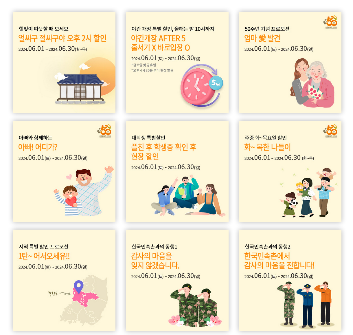 한국민속촌 이용 시 제휴카드 할인 이외에도 6월에만 적용되는 다양한 할인 이벤트가 있으니 방문 전 꼼꼼히 알아보시고 가길 권해드립니다.
