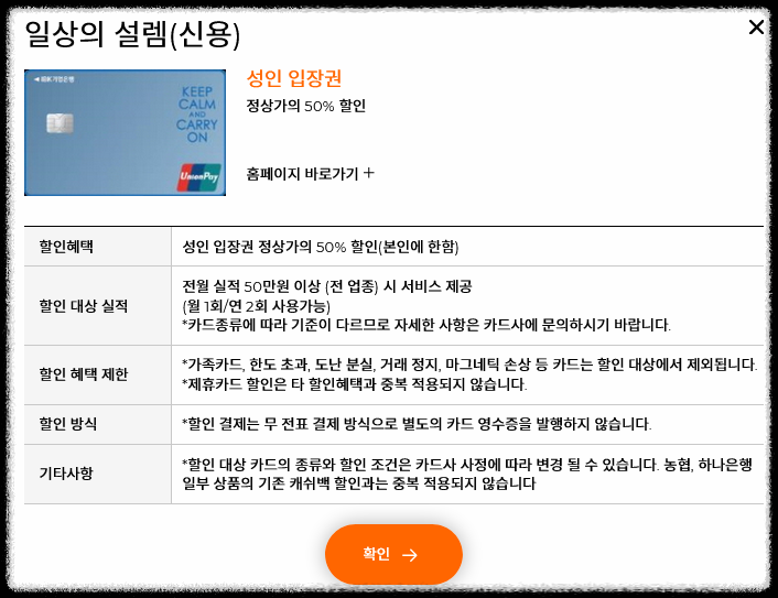 위의 링크를 통해 가시면 카드별 자세한 할인 혜택 안내를 받으실 수 있습니다.