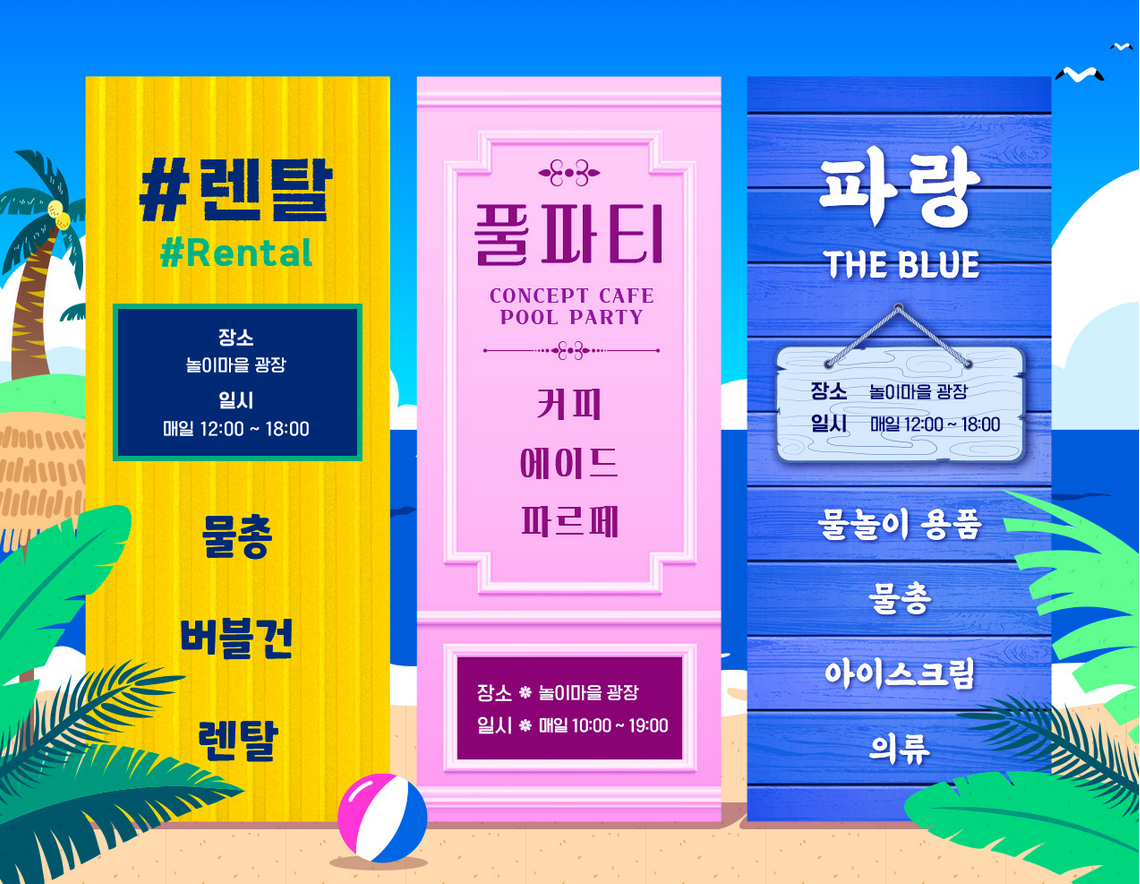 물총, 버블건 및 물놀이 용품 렌탈 및 구매와 다양한 음료 먹을거리 등을 판매하는 곳도 구비되어 있습니다.
