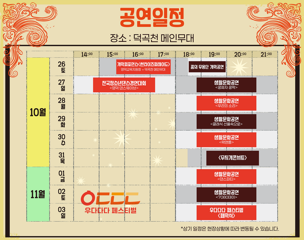 영덕생활문화축제 <우다다다페스티벌>입니다. 영덕군민들이 만들어가는 생활문화축제 <우다다다페스티벌> 많은 관심 부탁드립니다.