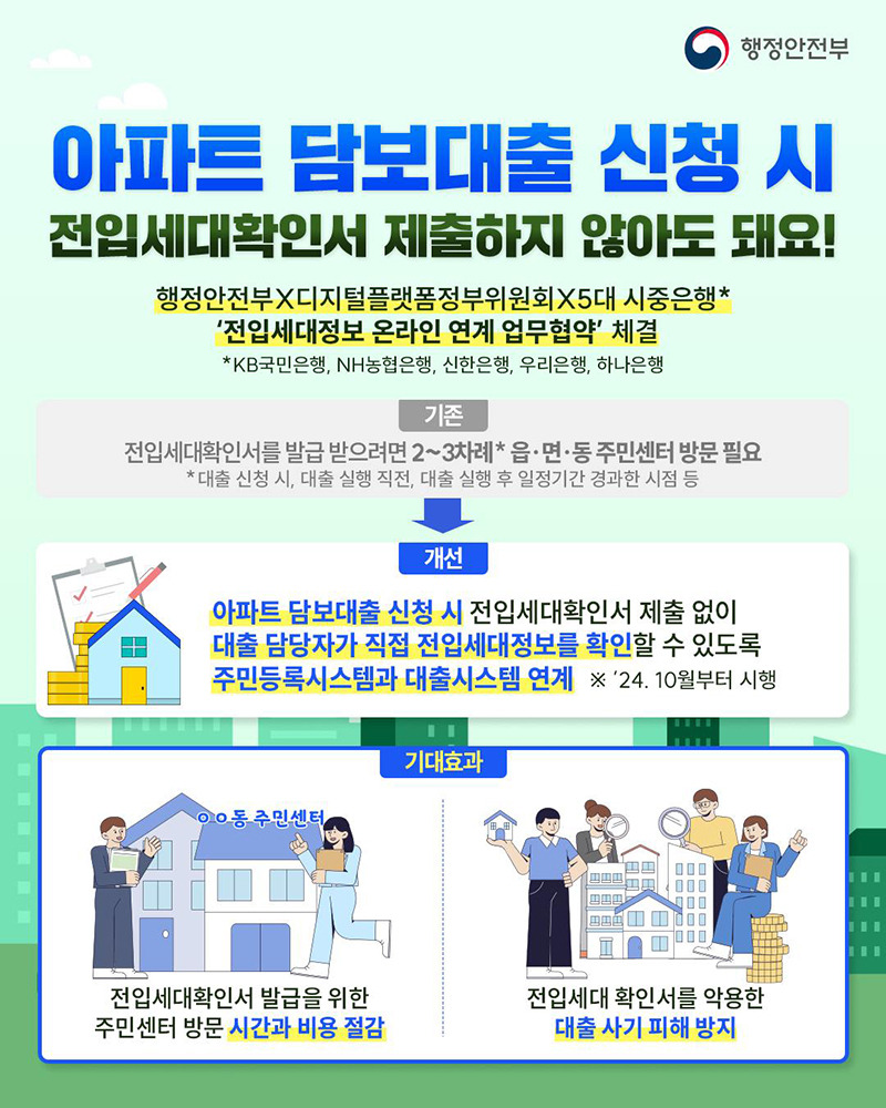 <개선> 아파트 담보대출 신청 시 전입세대확인서 제출 없이 대출 담당자가 직접 전입세대정보를 확인할 수 있도록 주민등록시스템과 대출시스템 연계.