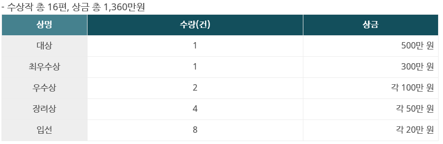 ■ 시상금 - 수상작 총 16편, 상금 총 1,360만원 상명수량(건)상금대상1500만 원최우수상1300만 원우수상2각 100만 원장려상4각 50만 원입선8각 20만 원 - 시상식 개최 : 11월 15일(금) 예정 ※유튜브 라