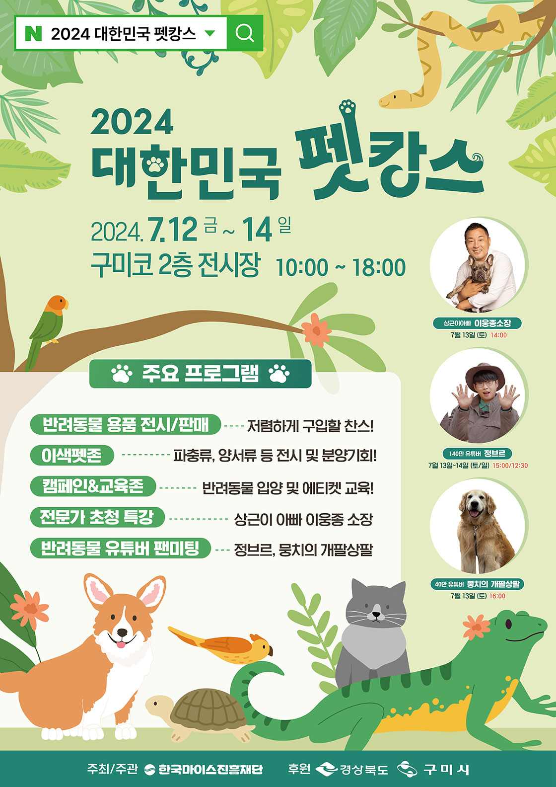 반려동물 인구구 무려 1500만 시대라고 합니다. 그러다 보니 반려동물과 함께 하는 여가 및 관광 산업 시장이 계속 활성화되고 있습니다. 경상북도와 구미시 후원으로 진행되는 펫캉스 축제는 반려견, 반려묘뿐만이 아닌 파충류, 양서류 등 다양한 반려동물을 위한 공간으로 마련됩니다. 구미코에서 진행되는 펫캉스 축제는 날짜 회차 상관없이 무료관람입니다.