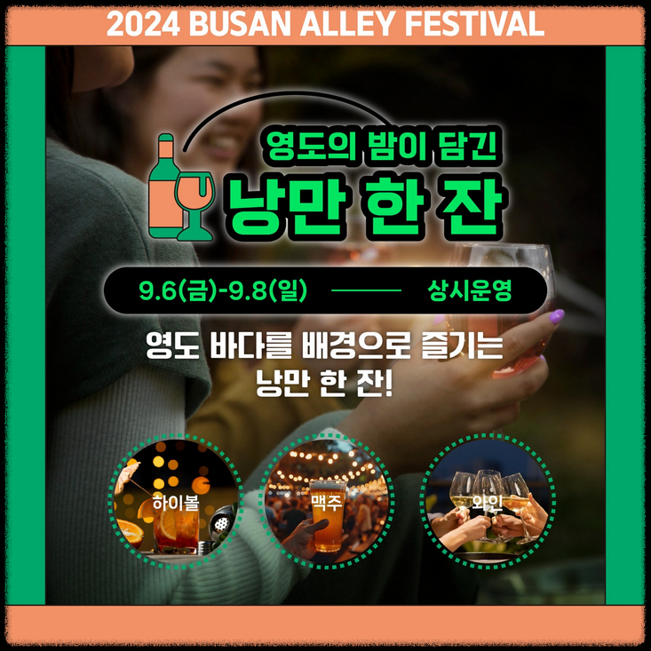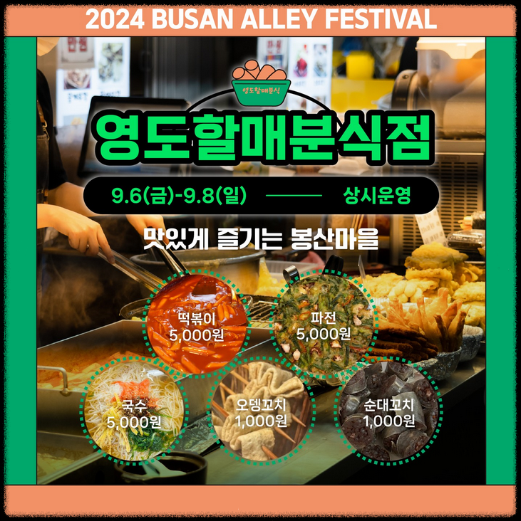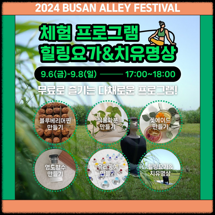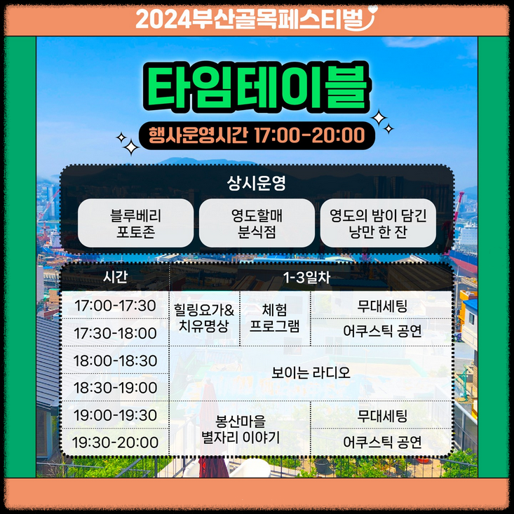 - 부대프로그램 : 체험프로그램, 힐링요가&치유명상, 영도할매분식점&영도의 밤이 담긴 낭만 한 잔