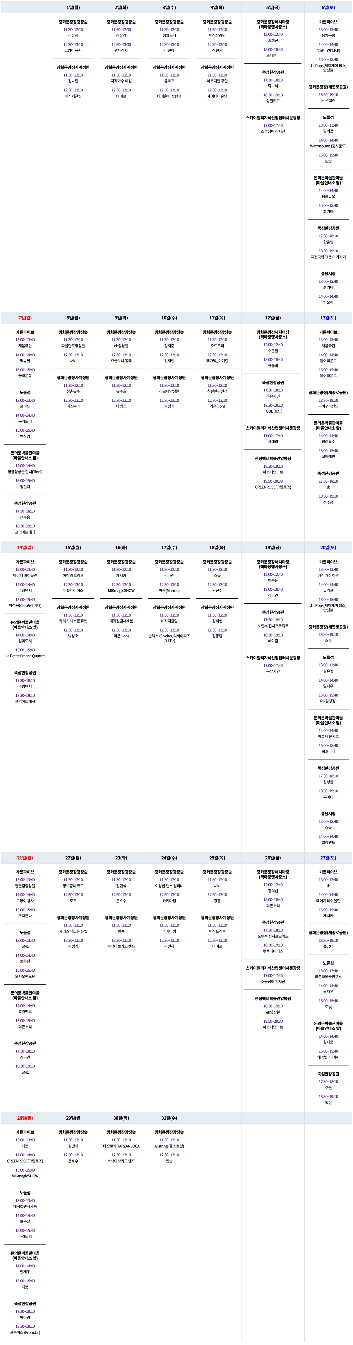 ※ 공연 일정은 공연팀 개인 사유 / 공연장소 운영 / 기상상황 등으로 변경 및 취소될 수 있습니다.