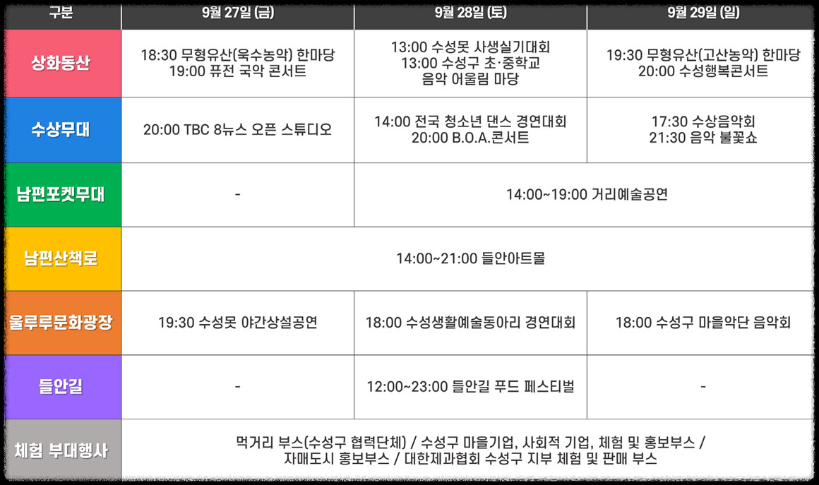 ● 축제 내용 : 수성행복콘서트, 퓨전국악콘서트, 거리예술공연 등
