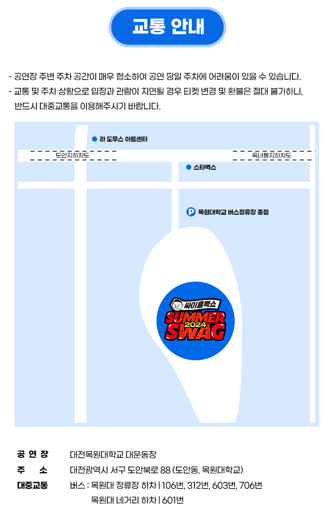 대전에서 열리는 2024 싸이 흠뻑쇼는 7월 27일과 28일 각 오후 6시 두 차례 진행합니다. 흠뻑쇼의 진행장소는 대전목원대학교 대운동장에서 열리니 위그림의 배치도를 확인해 보시기 바랍니다.
