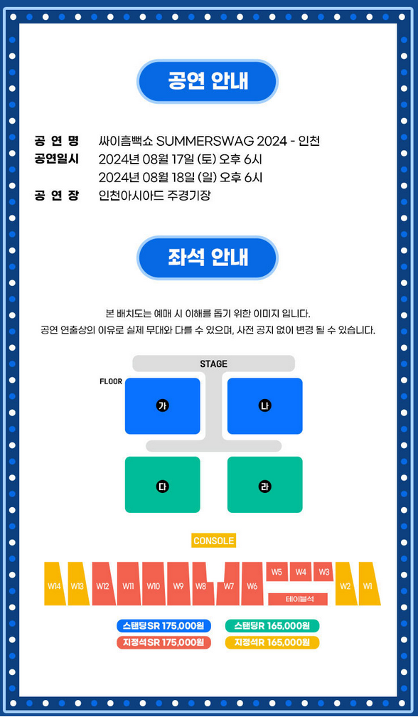 ● 2024 싸이 흠뻑쇼 인천은 2024년 8월 17일(토) ~ 8월 18일(일) 각각 오후 2시 이틀에 걸쳐서 진행됩니다. 공연 장소는 인천아시아드 주 경기장이고 위 좌석 배치도를 참고하시기 바랍니다.