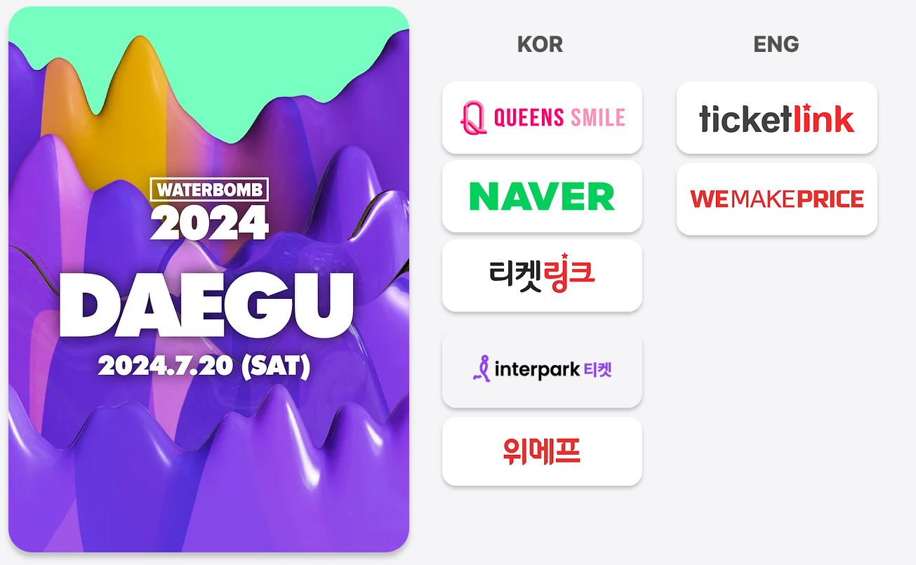 워터밤 2024 대구 할인된 금액으로 예매하러 가기(네이버, 티켓링크, 인터파크, 위메프 등)