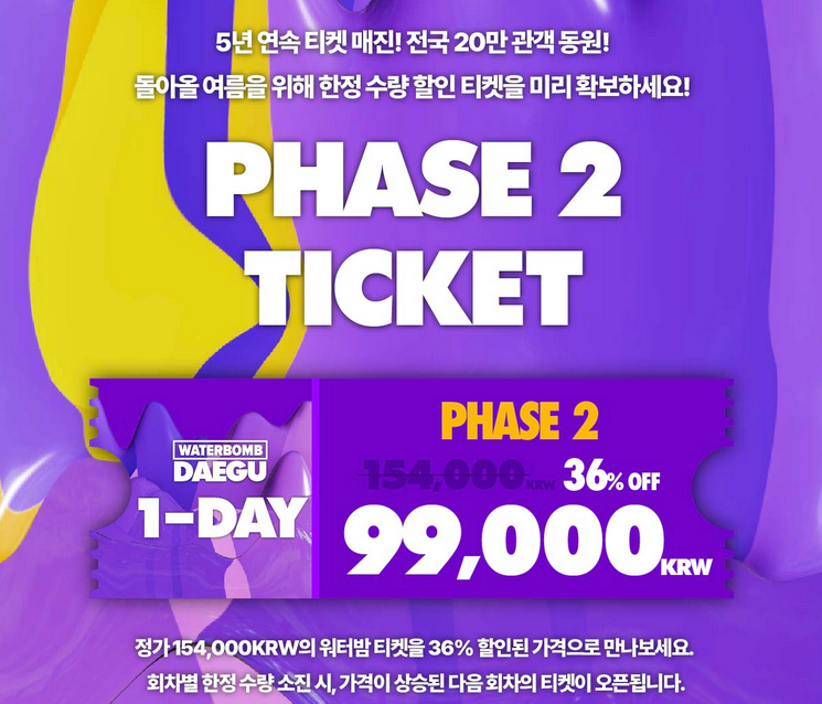 올해도 어김없이 워터밤의 계절이 다가왔습니다. 2024 워터밤 행사가 지난 7월 5일 서울을 시작으로 전국 투어를 시작했습니다. 7월 20일 토요일 대구에서 2024 워터밤이 행사가 진행될 예정입니다. 빠른 예매 시 정가 154,000원의 워터밤 티켓을 36% 할인된 99,000원으로 예매가 가능하니 서두르셔야 할 듯합니다.