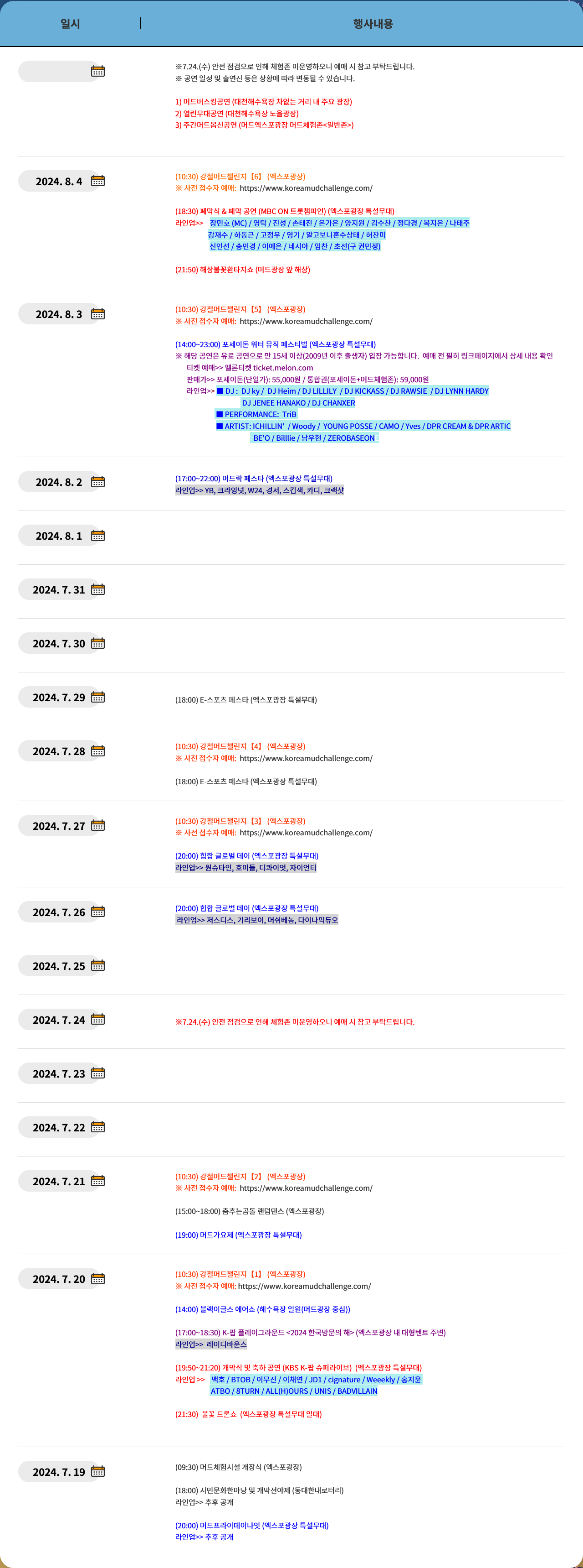 - 축제 개막식 및 축하 공연 : 07.20(토) 19:50~21:20(KBS K-팝 슈퍼라이브, 엑스포광장 특설무대)