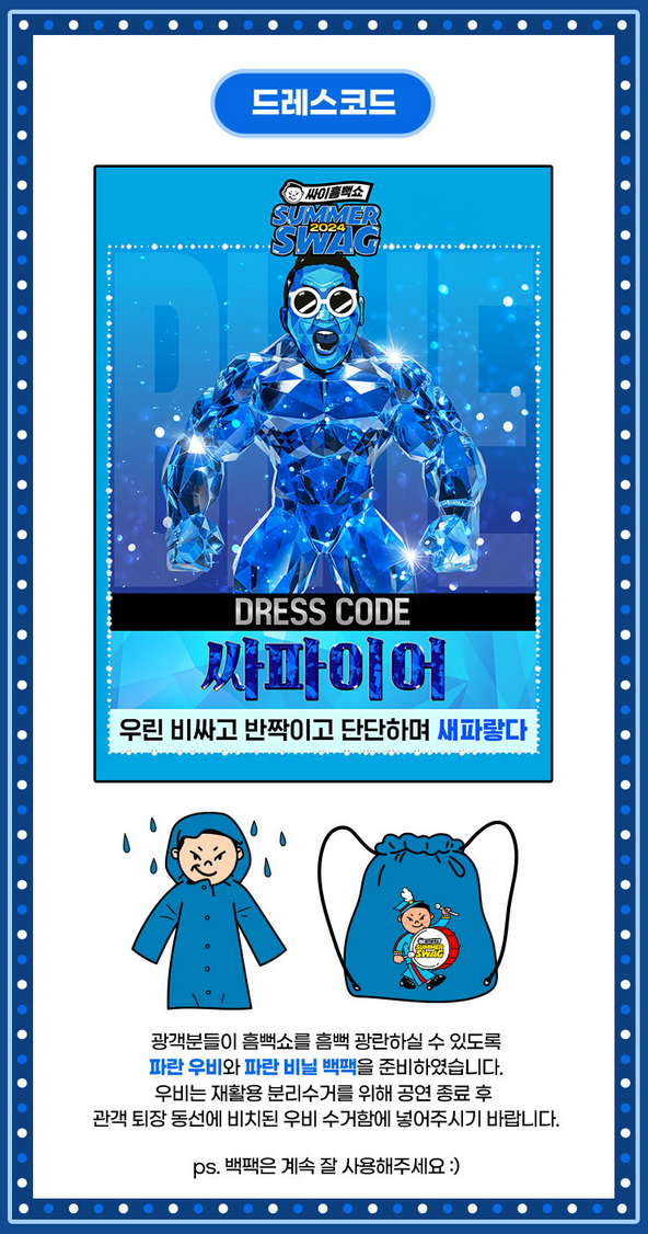 이번 싸이 흠뻑쇼에도 광(?)객들을 위해 파란색 우비와 백팩을 준비하였다고 합니다. 그리고 공연 시 사용될 'PSYlight(LED너클밴드)도 제공하니 별도의 응원봉등의 도구를 준비하지 않으셔도 될듯합니다.