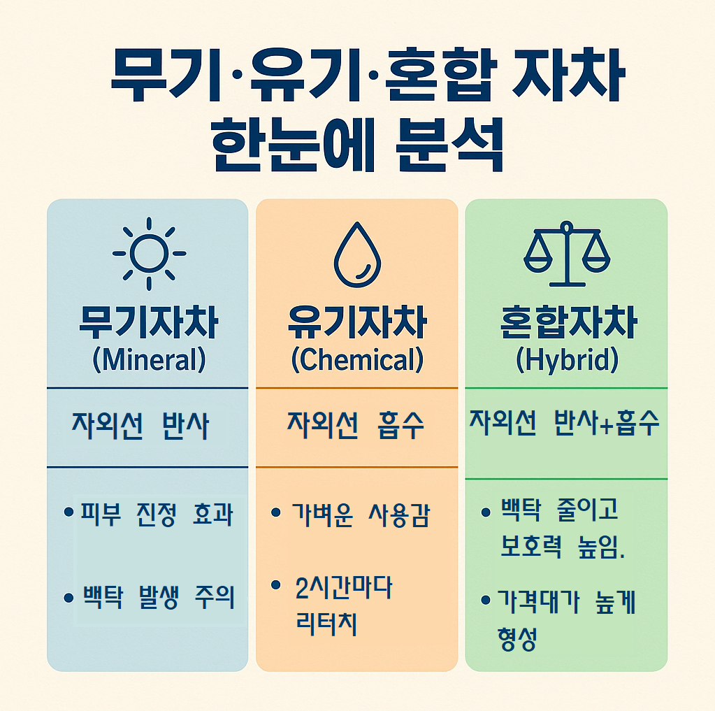오늘 포스트에서 무기·유기·혼합 자차의 차이와 사용 상황별 최적의 선크림 선택법을 알려드릴게요!