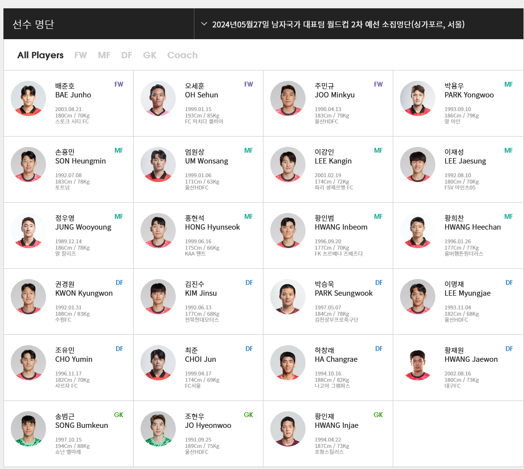 2. 대한민국 국가 대표팀 소집 명단