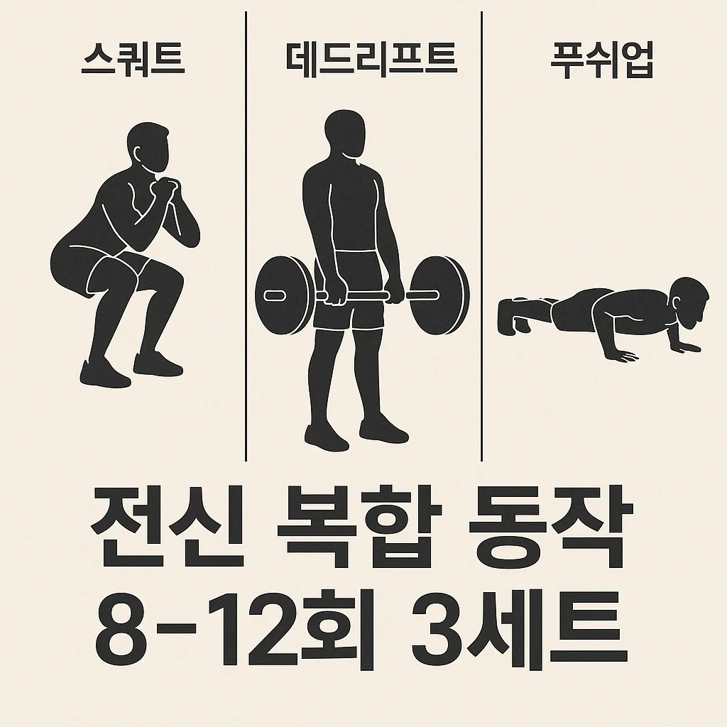 주 3회, 전신 복합 동작(스쿼트·데드리프트·푸시업)을 8~12회 3세트.