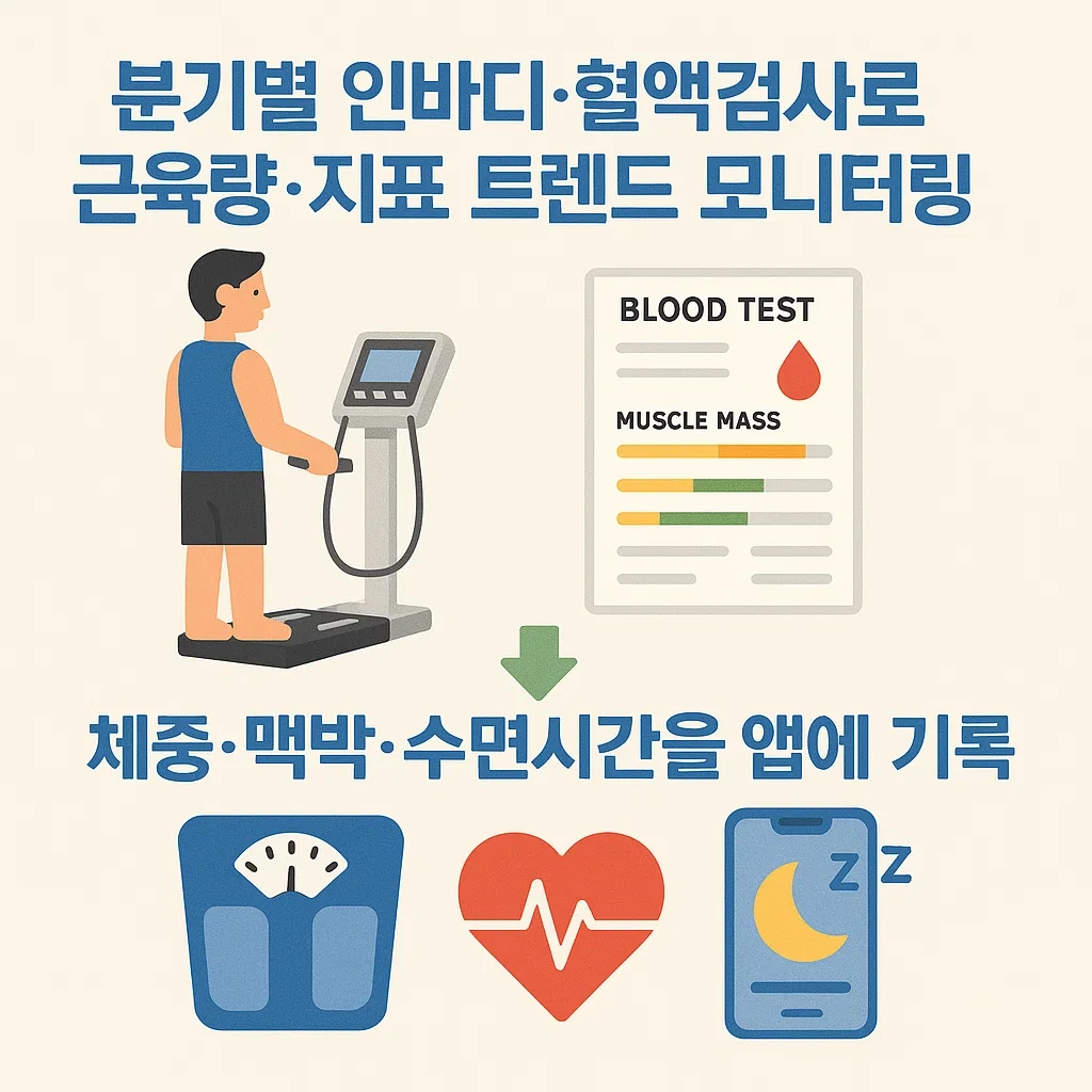 분기별 인바디·혈액검사로 근육량·지표 트렌드 모니터링.