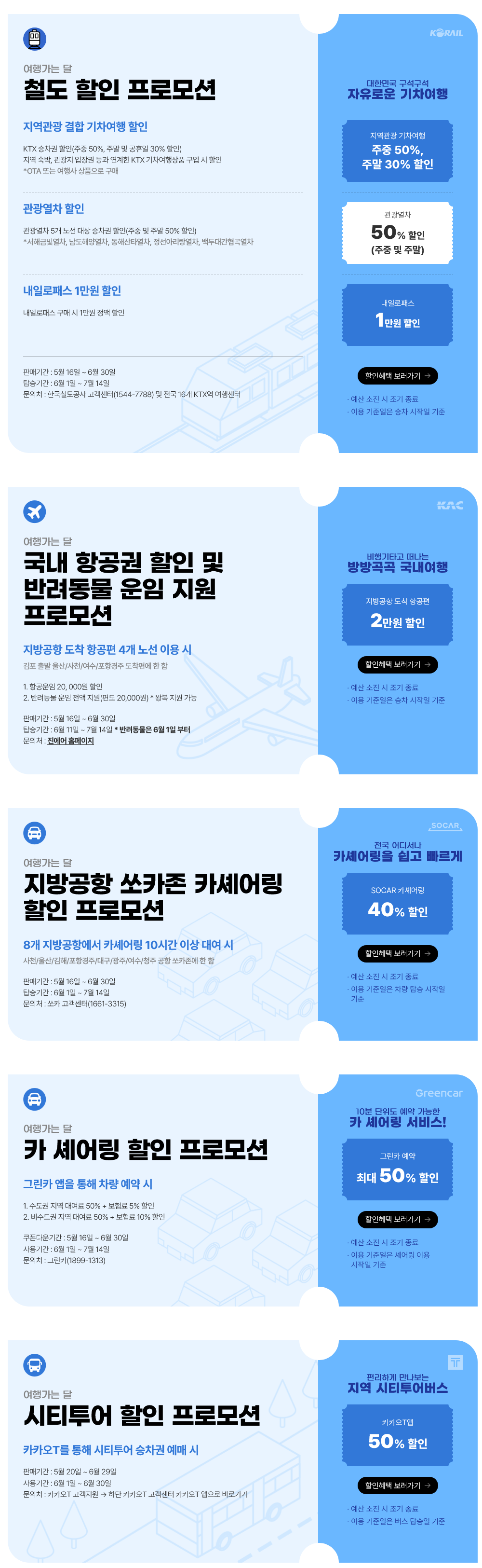 대한민국 구석구석 국내여행을 통한 지역관광 활성화를 위해 문화체육관광부, 한국관광공사와 전국의 지자체, 관광업계가 함께 추진하는 캠페인으로 다양한 할인 혜택과 여행 프로그램 및 이벤트가 제공됩니다. 문화체육관광부는 14일 한국관광공사와 함께 지역관광의 매력을 알리고 국내 여행을 통해 내수를 진작하기 위해 이날부터 다음 달 30일까지 '6월 여행 가는 달' 캠페인을 진행한다고 밝혔다.