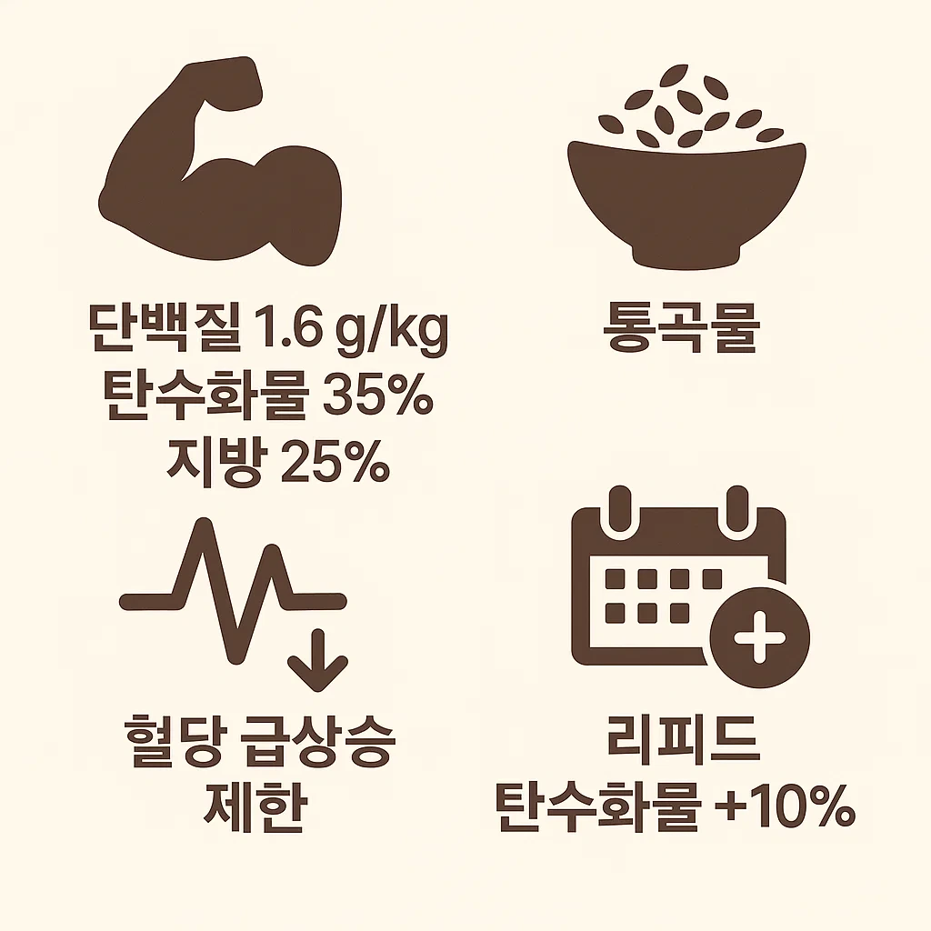 단백질 1.6 g/kg, 탄수 35 %, 지방 25 % 비율을 유지